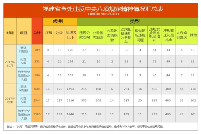 2017年10月,福建查处违反中央八项规定精神问题189件,处理253人,给予党纪政纪处分186人。截至10月31日,福建查处违反中央八项规定精神情况如下: