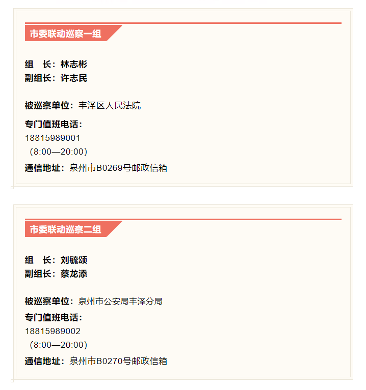 根据《中国共产党巡视工作条例》及中央、省委、市委关于巡视巡察工作的部署要求,按照省委巡视组关于开展联动巡察的工作安排,经市委巡察工作领导小组同意,从10月下旬开始,对丰泽区人民法院党组、泉州市公安局丰泽分局党委开展巡察。巡察时间30天左右。日前,2个联动巡察组已进驻巡察。