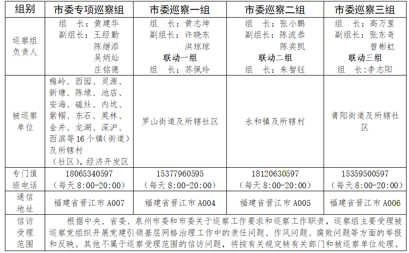 根据党中央关于巡视巡察决策部署及省委、泉州市委、晋江市委工作要求,经市委巡察工作领导小组研究决定,十四届市委党建引领基层网格治理专项巡察从2022年8月上旬开始,对各镇(街道)、经济开发区落实党建引领基层网格治理工作情况开展专项巡察(其中青阳街道、罗山街道、永和镇委托市委第二轮第一批常规巡察组进行监督检查),巡察时间20天左右。日前,专项巡察组已进驻被巡察单位。