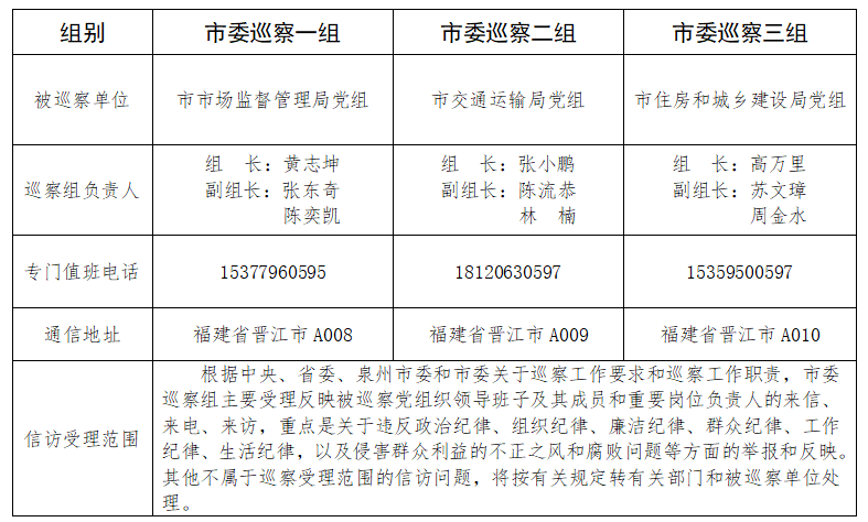 根据党中央关于巡视巡察决策部署及省委、泉州市委、晋江市委工作要求,经市委巡察工作领导小组研究决定,十四届市委第二轮第二批巡察从2022年9月中旬开始,巡察市住房和城乡建设局党组、交通运输局党组、市场监督管理局党组,巡察时间30天左右。日前,巡察组已进驻被巡察单位。