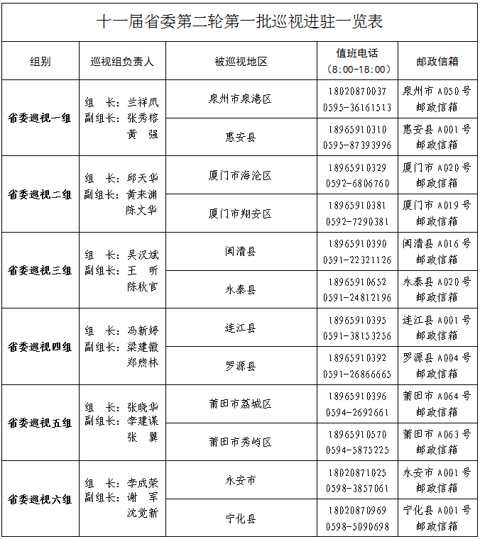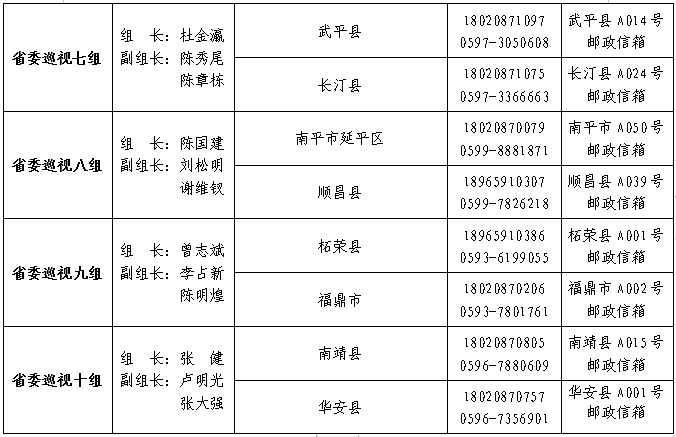 根据《中国共产党巡视工作条例》及省委《实施办法》规定,经省委同意,省委巡视组近期陆续进驻,对连江县、闽清县、罗源县、永泰县,厦门市海沧区、翔安区,南靖县、华安县,泉州市泉港区、惠安县,永安市、宁化县,莆田市荔城区、秀屿区,南平市延平区、顺昌县,武平县、长汀县,柘荣县、福鼎市等20个县(市、区)开展巡视,巡视时间40天左右。
