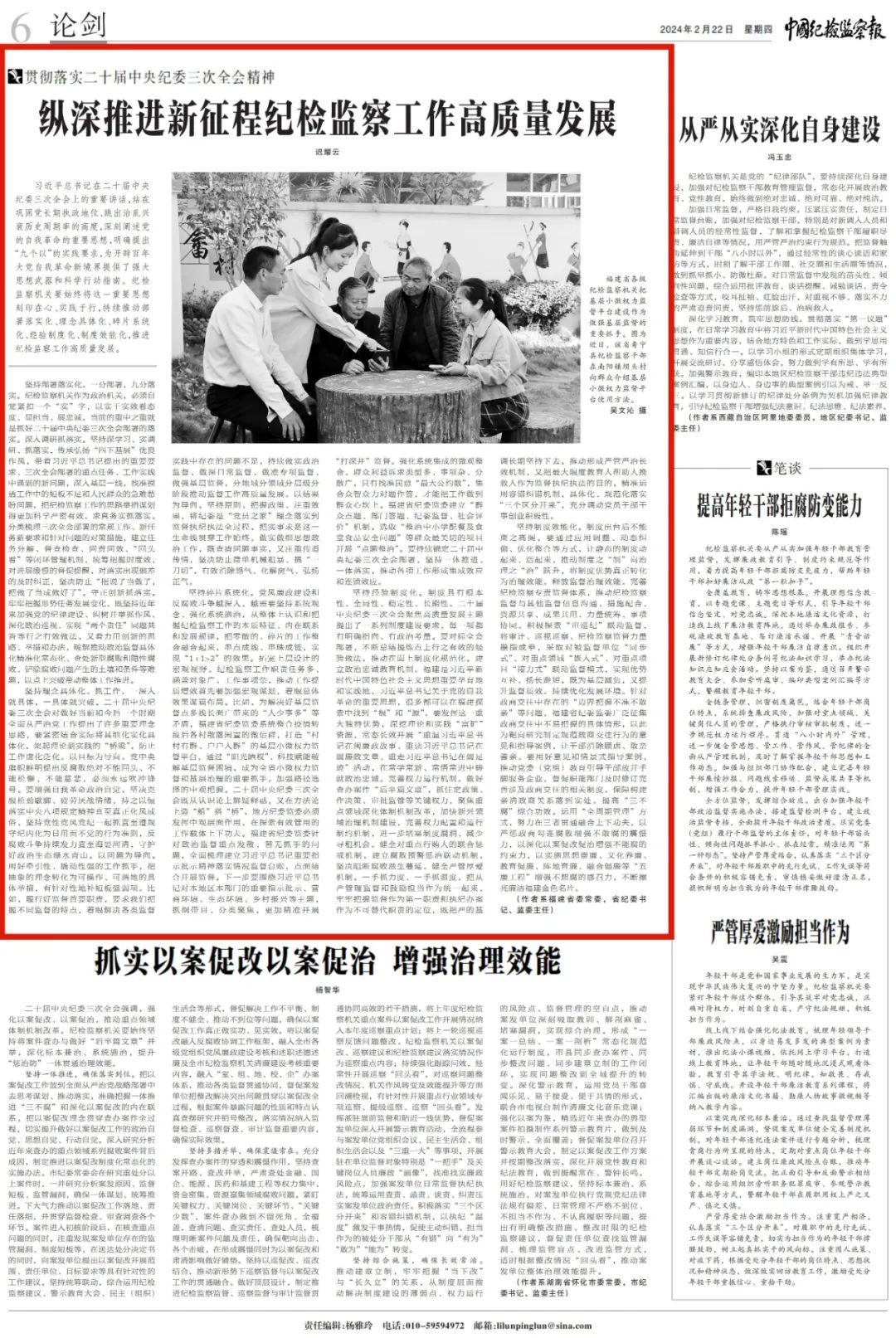 2月22日,《中国纪检监察报》第6版刊发了福建省委常委,省纪委书记、监委主任迟耀云的署名文章《纵深推进新征程纪检监察工作高质量发展》,现予以全文转载。
